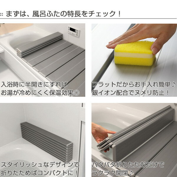●素材に銀イオンを配合!細菌の増殖によるヌメリを防止!●スタイリッシュなデザイン!折りたたむとコンパクトになり小さな浴槽にもおすすめ!●パタパタと折りたたむだけでラクラク開閉!■塩素殺菌・浴槽水浄化保温装置(24時間風呂)をご使用の方へ塩素殺菌・浴槽水浄化保温装置(24時間風呂)に使用されますと、風呂ふた表面の荒れ、退色などの変化を生じさせるおそれがありますので、ご使用をお避けください。